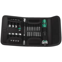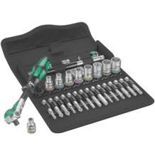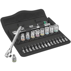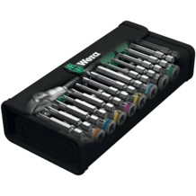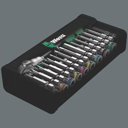 Una configuración del juego increíblemente compacta que ofrece muchísima herramienta en muy poco espacio. Se obtiene una sensación completamente nueva con relación a esta clase de juegos de carraca gracias, a las novedosas cajas de material textil sumamente robustas y duraderas que además se pueden posicionar de forma vertical para conseguir un mayor orden en la estantería del taller. El material exterior textil de la caja ofrece además una protección adicional de las superficies. Peso y volumen son mínimos lo que facilita la movilidad para el usuario. Con sistema de búsqueda de herramienta Take it easy: marcas de color según el tamaño.