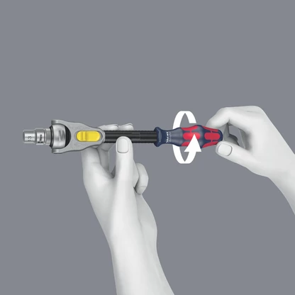 Las carracas Zyklop Speed son unos verdaderos milagros en rapidez: La construcción de masa de inercia permite una aceleración del proceso de atornillado. La construcción de simetría rotativa del mango tipo Kraftform, así como el manguito de giro libre, apoyan el movimiento rotativo extremamente veloz, especialmente cuando durante el atornillado no hay apenas resistencia en la rosca.