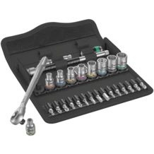 Una configuración del juego increíblemente compacta que ofrece muchísima herramienta en muy poco espacio. Se obtiene una sensación completamente nueva con relación a esta clase de juegos de carraca gracias, a las novedosas cajas de material textil sumamente robustas y duraderas que además se pueden posicionar de forma vertical para conseguir un mayor orden en la estantería del taller. El material exterior textil de la caja ofrece además una protección adicional de las superficies. Peso y volumen son mínimos lo que facilita la movilidad para el usuario. Con sistema de búsqueda de herramienta Take it easy: marcas de color según el tamaño.