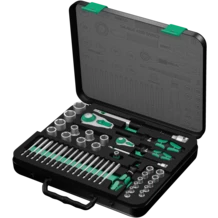 Juego Zyklop de 43 piezas en una caja de metal muy estable: carraca Zyklop con arrastre de 1/4" y carraca Zyklop con arrastre de 1/2". Gracias a la dentadura fina con 72 dientes se tiene un ángulo de recuperación de tan sólo 5°. La cabeza de la carraca es libremente pivotable y se puede bloquear en cualquier posición gracias a la corredera en ambos lados. Incluso en espacios de montaje muy estrechos o difícilmente accesibles, es posible realizar un trabajo descomplicado con mucha libertad para las manos. La fijación definida en 0°, 15° y 90° hacia la izquierda y la derecha garantiza un trabajo seguro sin que se resbale la cabeza de la carraca. En la posición de 0° y con ayuda del adaptador y de las puntas, la carraca se puede utilizar como un destornillador normal. La construcción de masas de inercia produce un aceleramiento del proceso de atornillar. La geometría simétrica rotacional del mango Kraftform y el manguito de giro libre apoyan el movimiento ultrarrápido de retorcimiento. Gracias a la forma del mango Kraftform que se adapta tan excelentemente bien a la mano, se evitan lesiones y molestias como ampollas y callosidades. Los materiales duros que se utilizan en la elaboración del mango garantizan un movimiento de cambio del agarre rápido sin que exista el riesgo de que el mango se adhiera a la piel. Las zonas más blandas, o sea las "no resbalosas", permiten la transmisión de altas fuerzas sin pérdida alguna. Adecuado para llaves de vaso cuadradas de 1/4" así como para piezas de conexión de 1/4" con arrastre de cuadrado; con bloqueo de bola. Con 21 vasos Zyklop, 2 prolongaciones Zyklop con manguito de giro rápido, 1 porta-puntas Kraftform con sistema de cambio rápido, 16 puntas. Con el sistema de búsqueda fácil de herramienta Take it easy que prevé una marcación de la herramienta según el tamaño.