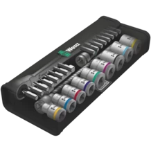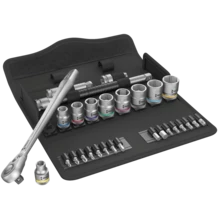 Una configuración del juego increíblemente compacta que ofrece muchísima herramienta en muy poco espacio. Se obtiene una sensación completamente nueva con relación a esta clase de juegos de carraca gracias, a las novedosas cajas de material textil sumamente robustas y duraderas que además se pueden posicionar de forma vertical para conseguir un mayor orden en la estantería del taller. El material exterior textil de la caja ofrece además una protección adicional de las superficies. Peso y volumen son mínimos lo que facilita la movilidad para el usuario. Con sistema de búsqueda de herramienta Take it easy: marcas de color según el tamaño.