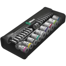 Una configuración del juego increíblemente compacta que ofrece muchísima herramienta en muy poco espacio. Se obtiene una sensación completamente nueva con relación a esta clase de juegos de carraca gracias, a las novedosas cajas de material textil sumamente robustas y duraderas que además se pueden posicionar de forma vertical para conseguir un mayor orden en la estantería del taller. El material exterior textil de la caja ofrece además una protección adicional de las superficies. Peso y volumen son mínimos lo que facilita la movilidad para el usuario. Con sistema de búsqueda de herramienta Take it easy: marcas de color según el tamaño.