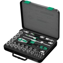 Juego Zyklop de 37 piezas en un maletín estable de metal: Carraca Zyklop con arrastre de 1/2". Gracias a la dentadura fina de 72 dientes se consigue un ángulo mínimo de recuperación de tan sólo 5°. La cabeza de la carraca es libremente pivotable y se puede bloquear en cualquier posición gracias a la corredera en ambos lados. Incluso en espacios de montaje muy estrechos o difícilmente accesibles es posible realizar un trabajo descomplicado con mucha libertad para las manos. La fijación definida en 0°, 15° y 90° hacia la izquierda y la derecha, garantiza un trabajo seguro sin que se resbale la cabeza de la carraca. En la posición de 0° y con ayuda del adaptador y de las puntas, la carraca se puede utilizar como un destornillador normal. La construcción de masas de inercia produce un aceleramiento del proceso de atornillar. La geometría simétrica rotacional del mango Kraftform así como el manguito de giro libre apoyan el movimiento ultrarrápido de retorcimiento. Gracias a la forma del mango Kraftform que se adapta tan excelentemente bien a la mano, se evitan lesiones y molestias como ampollas y callosidades. Los materiales duros que se utilizan en la elaboración del mango garantizan un movimiento de cambio del agarre rápido sin que exista el riesgo de que el mango se adhiera a la piel. Las zonas más blandas, "no resbalosas", permiten la transmisión de altas fuerzas sin pérdida alguna. Adecuado para llaves de vaso cuadradas de 1/2" así como piezas de conexión de 1/2" con arrastre cuadrado; con bloqueo de bola. Con 17 vasos Zyklop, 2 prolongaciones Zyklop con manguito de giro rápido, 1 mango en T, 1 articulación cardán, 1 prolongación "Wobble", 1 pieza de conexión con sistema de cambio rápido, 13 puntas. Con sistema de búsqueda de herramienta Take it easy: marcas de color según el tamaño.