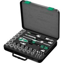 Juego Zyklop de 38 piezas en un maletín estable de metal: Carraca Zyklop con arrastre de 1/2". Gracias a la dentadura fina de 72 dientes se consigue un ángulo mínimo de recuperación de tan sólo 5°. La cabeza de la carraca es libremente pivotable y se puede bloquear en cualquier posición gracias a la corredera en ambos lados. Incluso en espacios de montaje muy estrechos o difícilmente accesibles es posible realizar un trabajo descomplicado con mucha libertad para las manos. La fijación definida en 0°, 15° y 90° hacia la izquierda y la derecha garantiza un trabajo seguro sin que se resbale la cabeza de la carraca. En la posición de 0° y con ayuda del adaptador y de las puntas, la carraca se puede utilizar como un destornillador normal. La construcción de masas de inercia produce un aceleramiento del proceso de atornillar. La geometría simétrica rotacional del mango Kraftform así como el manguito de giro libre apoyan el movimiento ultrarrápido de retorcimiento. Gracias a la forma del mango Kraftform que se adapta tan excelentemente bien a la mano, se evitan lesiones y molestias como ampollas y callosidades. Los materiales duros que se utilizan en la elaboración del mango garantizan un movimiento de cambio del agarre rápido sin que exista el riesgo de que el mango se adhiera a la piel. Las zonas más blandas, "no resbalosas", permiten la transmisión de altas fuerzas sin pérdida alguna. Adecuado para llaves de vaso cuadradas de 1/2" así como piezas de conexión de 1/2" con arrastre cuadrado; con bloqueo de bola. Con 18 vasos de pulgadas Zyklop, 2 prolongaciones Zyklop con manguito de giro rápido, 1 mango en T, 1 articulación cardán, 1 prolongación "Wobble", 1 pieza de conexión con sistema de cambio rápido, 13 puntas. Con sistema de búsqueda de herramienta Take it easy: marcas de color según el tamaño.