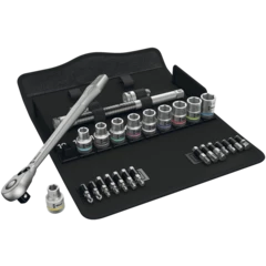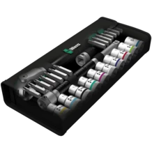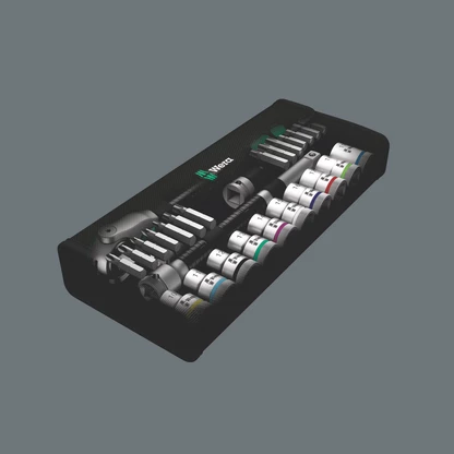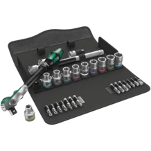 Una configuración del juego increíblemente compacta que ofrece muchísima herramienta en muy poco espacio. Se obtiene una sensación completamente nueva con relación a esta clase de juegos de carraca gracias, a las novedosas cajas de material textil sumamente robustas y duraderas que además se pueden posicionar de forma vertical para conseguir un mayor orden en la estantería del taller. El material exterior textil de la caja ofrece además una protección adicional de las superficies. Peso y volumen son mínimos lo que facilita la movilidad para el usuario. Con sistema de búsqueda de herramienta Take it easy: marcas de color según el tamaño.