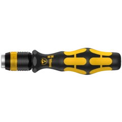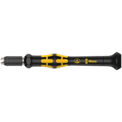 Porta-puntas manual ESD de alta calidad para trabajos electroestáticamente seguros: la resistencia eléctrica superficial del material ESD de Wera se sitúa en 106 - 109 ohmios. De esta forma, los componentes quedan protegidos de manera segura contra energía electroestática y los daños que ésta puede conllevar. El sistema Rapidaptor de cambio rápido permite un cambio ultrarrápido de las puntas sin herramienta auxiliar. El mango Kraftform Plus del destornillador proporciona un trabajo agradable y ergonómico que evita ampollas y callosidades. Las zonas duras de agarre permiten una alta velocidad de trabajo mientras que las zonas blandas de agarre garantizan una alta transmisión del par de giro. Adecuado para puntas de arrastre hexagonal exterior de 1/4" según la norma DIN ISO 1173-C 6,3 y E 6,3 (ISO 1173).