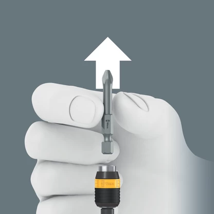 Para cambiar la punta simplemente se ha de desplazar el casquillo hacia adelante: En ese instante, el mecanismo de muelle separa la punta del imán y desbloquea así la herramienta. La punta se puede extraer sin problema alguno. Y lo que es especialmente útil: esta función también permite la extracción de puntas de dimensiones muy pequeñas sin que se tenga que utilizar herramienta adicional de ayuda.
