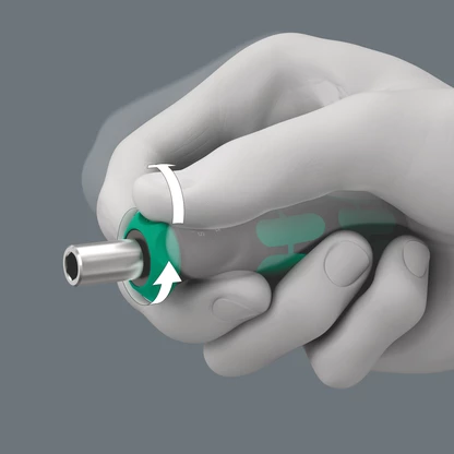 Un porta-puntas extremamente pequeño con una función de carraca de manejo intuitivo. El mecanismo de carraca que se encuentra integrado en el mango, con su dentado fino (36 dientes/ángulo de retorno de 10°) facilita y acelera el trabajo de atornillar sin tener que volver a reposicionar constantemente. El movimiento de giro ultrarrápido acelera el trabajo. El mecanismo de carraca que está integrado del todo en el mango, permite un trabajo sumamente práctico y libre de fatigas. La conmutación derecha/izquierda, o a posición de 0, se realiza de forma ergonómica. El mango Kraftform Plus permite un trabajo ergonómico en el cual se evita la formación de ampollas y callosidades en las manos. Un porta-puntas magnético para puntas con arrastre hexagonal exterior de 1/4". 4 puntas BiTorsion (BTZ) (ranura en cruz Phillipsy TORX®) para el uso universal. La zona BiTorsion amortigua los picos de carga y permite así una gran longevidad de las puntas. Todas las puntas vienen con el sistema de búsqueda de herramientas Take it easy: la cinta a color (el color marca el perfil del tornillo) adicionalmente lleva un sello con el tamaño correspondiente. Esto facilita la selección de la punta precisa.