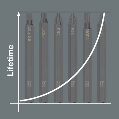 Punta extra-dura y extra-resistente para tornillos de hexágono interior. Así se evita la ruptura prematura de la punta y se alarga su vida útil. Adecuada para el uso con el destornillador de golpe 921 de Wera. Con arrastre hexagonal de 1/4".