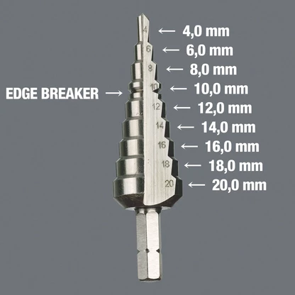 Punta-broca escalonada de alta calidad de Wera. 9 escalas de taladrado con ascenso de a 2 mm, utilizable en material de hasta 4,5 mm de grosor. Con redondeado de cantos (avellanador de chapa) en la de Ø 10 para chapas de 1 mm. Arrastre hexagonal de 1/4", adecuado para porta-puntas según normas DIN ISO 1173-D 6,3.