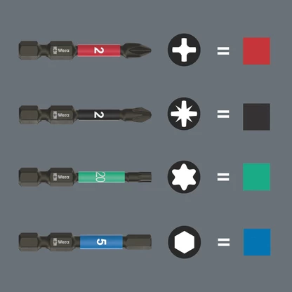 Puntas de alta calidad para tornillos Pozidriv*. La tecnología "Impaktor" proporciona vidas útiles sobreproporcionales de la herramienta, incluso en el caso de cargas extremamente altas. La resistencia friccional elevada que produce el recubrimiento con una capa rugosa de partículas de diamante en el extremo de la punta, evita que el útil se salga del tornillo por deslizamiento. Especialmente adecuadas para la aplicación con máquinas destornilladoras de impacto/de golpe habituales en el comercio. Hexagonal de 1/4", adecuado para porta-puntas según la norma DIN ISO 1173-F 6,3. *Pozidriv = marca registrada de la empresa European Industrial Service Ltd.