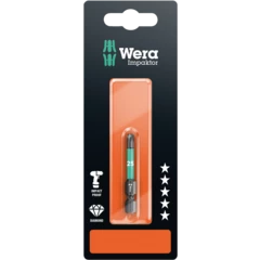 Para unas exigencias máximas de la herramienta de atornillar. Gracias al aprovechamiento de las características del material en combinación con las geometrías especialmente adaptadas a las cargas extremas, así como a unos procesos de elaboración especiales, las herramientas tipo Impaktor de Wera consiguen unos tiempos de servicio por encima del promedio. Una ventaja adicional del producto es el recubrimiento de las puntas con unas partículas minúsculas de diamante. Estas partículas reducen las así llamadas fuerzas de expulsión que en el caso de trabajos a máquina son especialmente altas y pueden conllevar un deslizamiento de la herramienta saliéndose del tornillo. Las partículas de diamante se aferran fuertemente en el tornillo. De esta forma, ya no se tiene que aplicar tanta fuerza de presión lo que reduce claramente la fatiga en trabajos de atornillamiento.
