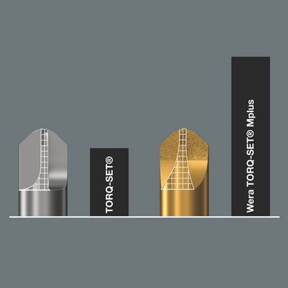 El perfil Mplus desarrollado por Wera, se caracteriza por unos flancos más resistentes en comparación con herramientas que llevan el perfil convencional tipo TORQ-SET®. Así se tiene un par de rotura mucho más alto y una longevidad claramente mayor de los útiles Wera TORQ-SET® Mplus.