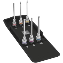 Juego de vasos de punta de hexágono interior, con función de retención para un trabajo en uniones atornilladas especialmente cómodo ya que se reduce el riesgo de que se pierda el tornillo al llevarlo hacia la pieza de trabajo.