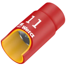 Vasos VDE de 3/8" que ofrecen una mayor seguridad gracias a la camisa interna de aislamiento de color amarillo que en el caso de un daño eventual de la capa exterior de aislamiento VDE de color rojo queda claramente visible. Se trata de una herramienta probada individualmente pieza por pieza según la norma IEC 60900 a 10.000 voltios para garantizar un trabajo seguro bajo la tensión permitida de 1.000 voltios.
