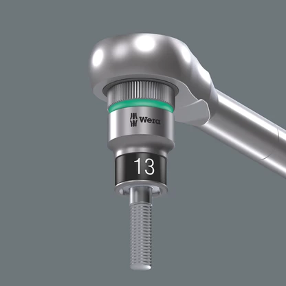 La sujeción del tornillo de hexágono exterior en la llave de vaso se realiza por medio de dos bolas de resorte y un tubo termoretráctil de elasticidad permanente y de alta resistencia. El tubo está protegido contra el desgaste y rasguños por un anillo de acero frontal. La función de retención es especialmente adecuada para situaciones de difícil acceso, en las cuales no es posible utilizar la mano para sostener el tornillo.