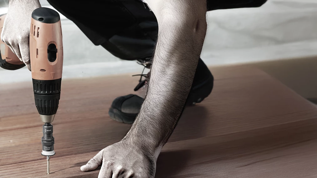 El porta-puntas 881/4/1 permite el avellanado o enrasado uniforme de los tornillos en la tarima de madera durante la construcción de terrazas. La profundidad de atornillado puede ajusterse según necesidad. Esto evita que los tornillos se hundan demasiado.