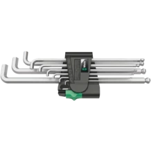 Juego de llaves acodadas de alta calidad con brazo extra-corto para el trabajo en tornillos difícilmente accesibles. Para tornillos de hexágono interior. Hex-Plus ofrece mayores superficies de apoyo dentro de la cabeza del tornillo. Así se reduce a un mínimo el efecto de entalladura, y la destrucción de la cabeza del tornillo se evita casi por completo. La cabeza esférica de hexágono en el brazo largo permite un trabajo seguro incluso en el caso de que el espacio del montaje sea limitado y difícil. El cuidadoso tratamiento de cromado en bastidor garantiza una alta protección anticorrosiva. Gracias a las marcas con el tamaño que están grabadas a láser de forma resistente y duradera, las llaves acodadas se tienen a mano rápidamente. Las llaves vienen en un clip práctico cuyo material es prácticamente libre de desgaste y que garantiza un alojamiento duraderamente seguro de los útiles, y al mismo tiempo facilita la extracción de las llaves.