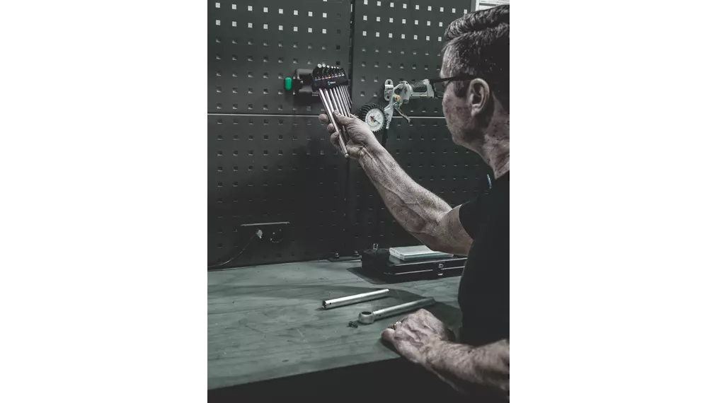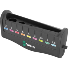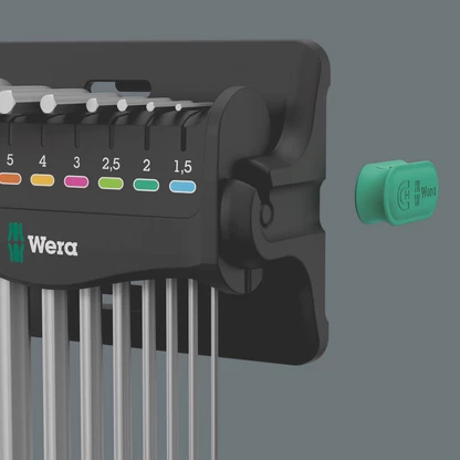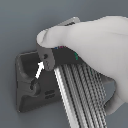 9 llaves acodadas de cromado mate, con la ventaja Hex-Plus contra el desgaste por redondeo de los tornillos, permiten que se tenga un surtido sólido de herramientas para tornillos de hexágono interior. El soporte en el que vienen los útiles permite un alojamiento muy práctico, o de forma parada en el mostrador, o para colgarlo en la pared. El soporte incluye un clip que se puede extraer para utilizarlo durante los trabajos móviles. El soporte además contiene un magnetizador extraíble sumamente ingenioso con ayuda del cual es posible magnetizar y volver a desmagnetizar los tornillos y también los extremos de las herramientas; así ya no hace falta sostener el tornillo con la otra mano, lo cual facilita el trabajo enormemente.