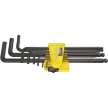 Juego de llaves acodadas de alta calidad para tornillos de hexágono interior de pulgadas, en el clip práctico de material resistente para un alojamiento constantemente seguro y una extracción fácil de las llaves. Llaves acodadas con perfil Hex-Plus: éste ofrece mayores superficies de apoyo dentro de la cabeza del tornillo. Así se reduce a un mínimo el efecto de entalladura y la destrucción de la cabeza del tornillo se evita casi por completo. La bola en el brazo largo permite un trabajo seguro incluso en situaciones de montaje complicadas. El tratamiento de superficie Black Laser proporciona una protección excelente de la superficie, también con relación a la corrosión, y garantiza una larga vida útil. Gracias a las duraderas marcas del tamaño grabadas a láser, las llaves siempre se tienen a mano rápidamente.