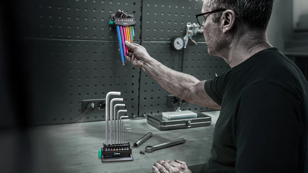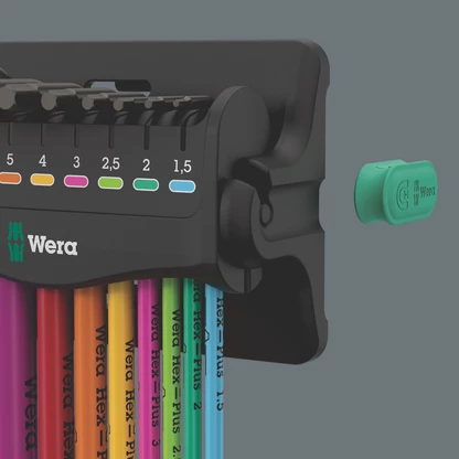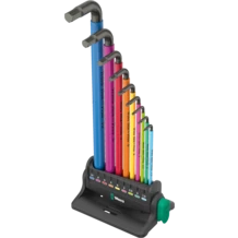 9 llaves acodadas con una camisa de material plástico (SPKL) de un material redondeado agradable al tacto. La cubierta exterior hace que el trabajo siempre sea agradable, incluso en el caso de bajas temperaturas, y cuida los dedos del usuario. Gracias a los códigos a color que llevan, todas las llaves se encuentran siempre de forma rápida. El soporte Rack 9109 en el que vienen los útiles permite un alojamiento muy práctico, o de forma parada en el mostrador, o para colgarlo en la pared. Además, el soporte incluye el Clip 9539 que se puede extraer para utilizarlo durante los trabajos móviles. El soporte además contiene el magnetizador 9538, extraíble y sumamente ingenioso, con ayuda del cual es posible magnetizar (y volver a desmagnetizar) los tornillos y también los extremos de las herramientas; así ya no hace falta sostener el tornillo con la otra mano lo cual facilita el trabajo enormemente.