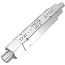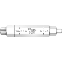 Con solo una punta es posible accionar cuatro perfiles de tornillos diferentes: (tornillos de hexágono interior de los tamaños 2,5; 5,0; 6,0, y tornillos TORX® del tamaño TX 25 ). Gracias a la enorme ventaja de espacio, esta punta es sumamente adecuada para trabajos móviles. Además se da un ahorro claro del peso de más del 50 %. La funcionabilidad de los perfiles grandes la permiten las salidas pequeñas que se sumergen con ayuda de muelles. La punta dispone de un arrastre hexagonal de 1/4" (serie de conexión de Wera 1), y así también es utilizable con, por ejemplo, carracas de punta y porta-puntas con Rapidaptor.
