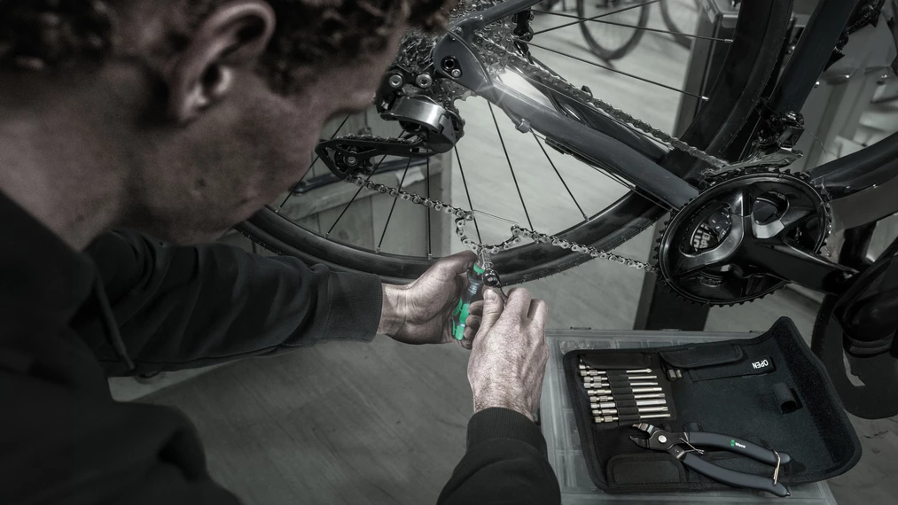 Juego de 18 piezas para el taller de bicicletas. Con ayuda de la carraca de puntas Zyklop Mini, del porta-puntas manual y de las puntas de 89 mm o de 25 mm, es posible trabajar en tornillos de hexágono interior, TORX® y ranura en cruz Phillips. Por medio del tronchacadenas, del soportacadenas y del perno de remache intercambiable, que contiene el juego, es posible abrir y cerrar cadenas de bicicleta (adecuado para cadenas Single-Speed de hasta 12 velocidades). La pinza para cierres de cadenas facilita el abrir y cerrar cadenas con cierre de cadena.