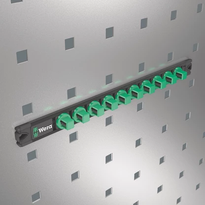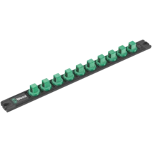 1 listón magnético, vacío. Adecuado para hasta 10 llaves de vaso y/o vasos de punta con arrastre de 1/2". El listón magnético permite una colocación temporal en superficies metálicas, y gracias a la función Twist to unlock ("gira y desbloquea"), se dispone de un bloqueo y desbloqueo seguro de los vasos.