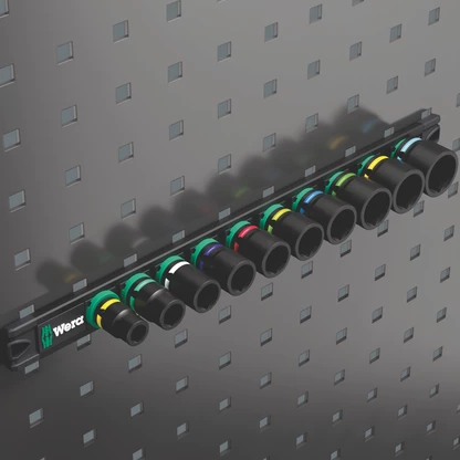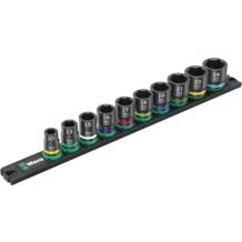 Listón magnético de vasos con 10 llaves de vaso Impaktor para el uso con atornilladoras eléctricas o de aire comprimido con arrastre de 3/8". La tecnología Impaktor permite unos tiempos de servicio por encima del promedio, incluso bajo cargas extremas. El perfil hexagonal que se utiliza permite una alta transmisión de la fuerza, y al mismo tiempo una gran precisión, sin deteriorar el perfil. Lleva el sistema de búsqueda de herramientas Take it easy con marcas a color según el tamaño - para encontrar la herramienta precisa de manera fácil y rápida. El listón magnético permite la fijación temporaria en superficies metálicas, y - gracias a la función "Twist to unlock" - dispone de un bloqueo y un desbloqueo seguro de los vasos.