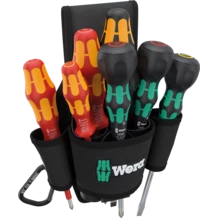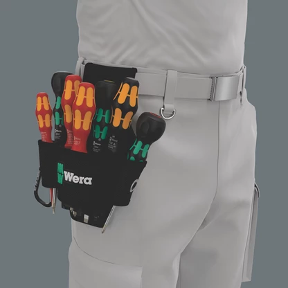 El mango tipo Kraftform Plus permite un trabajo agradable y ergonómico, evitando así la formación de ampollas y callosidades en las manos. Las zonas duras de agarre permiten altas velocidades de trabajo mientras que las zonas blandas garantizan una alta transmisión de la fuerza. En parte los útiles llevan Lasertip: el extremo de la varilla de los destornilladores Wera Lasertip ha sido tratado con rayos Laser para conseguir una rugosidad microscópicamente fina. Esta superficie rugosa prácticamente se aferra fuertemente en la cabeza del tornillo como si tuviera dientes. Así ya no es posible que el útil se desprenda de forma involuntaria deslizándose del tornillo. El sistema de búsqueda de herramientas Take it easy con sus marcas a color y sus sellos según el tamaño, permite encontrar la herramienta precisa de forma fácil y rápida.