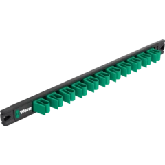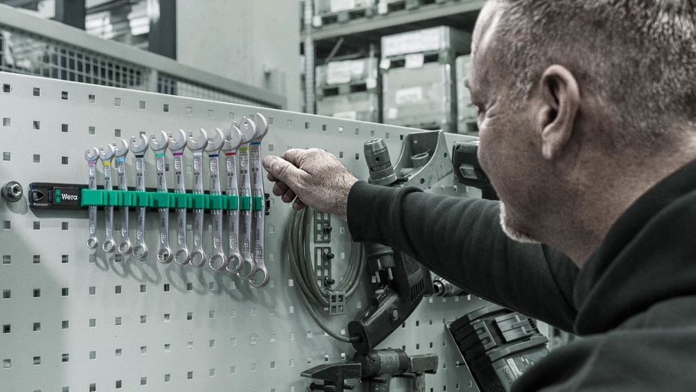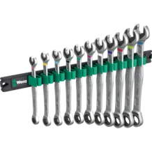 La llave combinada con carraca Joker 6000 con función de sujeción para cabezas de tornillos y tuercas hexagonales. La placa metálica intercambiable que lleva en su boca, asegura tornillos y tuercas por medio de sus dientes extra-duros. El tope final integrado es capaz de evitar el resbalamiento desde la cabeza del tornillo hacia abajo, y permite la aplicación de altos pares de giro. Gracias a la geometría de doble hexágono, se tiene una conexión completa de tornillo o tuerca, lo cual disminuye el riesgo de resbalamientos. El ángulo de retorno de tan solo 30° al lado de la boca, evita las pérdidas de tiempo al tener que darle la vuelta reiteradamente a la llave durante el trabajo de atornillar. El mecanismo de carraca al lado del anillo dispone de un dentado excepcionalmente fino de 80 dientes para lograr más flexibilidad en espacios de montaje estrechos. La geometría especial del forjado permite altas transmisiones del par de giro y una gran rigidez de flexión. Gracias a la fabricación de cromo-molibdeno con recubrimiento de níquel-cromo, se consigue una protección anticorrosiva muy eficiente. Lleva el sistema de búsqueda de herramientas Take it easy: con marcas a color según el tamaño. Los muelles de sujeción que integra el listón permiten un alojamiento perfecto y seguro de los útiles. Gracias al fuerte imán que lleva, el listón se mantiene de forma segura en superficies metálicas. De forma alternativa, el listón también se puede atornillar en la pared.