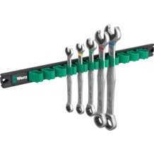 Juego de llaves combinadas con carraca, de 5 piezas, medidas métricas; en una listón de muelles. La llave carraca de boca y anillo Joker 6000 con función de sujeción para cabezas de tornillos y tuercas hexagonales. La placa metálica intercambiable que lleva en su boca, asegura tornillos y tuercas por medio de sus dientes extra-duros. El tope final integrado es capaz de evitar el resbalamiento desde la cabeza del tornillo hacia abajo y permite la aplicación de altos pares de giro. Gracias a la geometría de doble hexágono, se tiene una conexión completa de tornillo o tuerca, lo cual disminuye el riesgo de resbalamientos. El ángulo de retorno de tan solo 30° al lado de la boca evita las pérdidas de tiempo al tener que darle la vuelta reiteradamente a la llave durante el trabajo de atornillar. El mecanismo de carraca al lado del anillo dispone de un dentado excepcionalmente fino de 80 dientes para lograr más flexibilidad en espacios de montaje estrechos. La geometría especial del forjado permite altas transmisiones del par de giro y una gran rigidez de flexión. Gracias a la fabricación de cromo-molibdeno con recubrimiento de níquel-cromo, se consigue una protección anticorrosiva muy eficiente. Lleva el sistema de búsqueda de herramientas Take it easy: con marcas a color según el tamaño. Los muelles de sujeción que integra el listón permiten un alojamiento perfecto y seguro de los útiles. Gracias al fuerte imán que lleva, el listón se mantiene de forma segura en superficies metálicas. De forma alternativa, el listón también se puede atornillar en la pared.