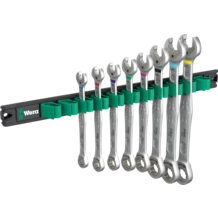 Juego de llaves combinadas con carraca, de 8 piezas, medidas en pulgadas; en un listón de muelles. La llave carraca de boca y anillo Joker 6000 con función de sujeción para cabezas de tornillos y tuercas hexagonales. La placa metálica intercambiable que lleva en su boca asegura tornillos y tuercas por medio de sus dientes extra-duros. El tope final integrado es capaz de evitar el resbalamiento desde la cabeza del tornillo hacia abajo y permite la aplicación de altos pares de giro. Gracias a la geometría de doble hexágono, se tiene una conexión completa de tornillo o tuerca, lo cual disminuye el riesgo de resbalamientos. El ángulo de retorno de tan solo 30° al lado de la boca evita las pérdidas de tiempo al tener que darle la vuelta reiteradamente a la llave durante el trabajo de atornillar. El mecanismo de carraca al lado del anillo dispone de un dentado excepcionalmente fino de 80 dientes para lograr más flexibilidad en espacios de montaje estrechos. La geometría especial del forjado permite altas transmisiones del par de giro y una gran rigidez de flexión. Gracias a la fabricación de cromo-molibdeno con recubrimiento de níquel-cromo, se consigue una protección anticorrosiva muy eficiente. Lleva el sistema de búsqueda de herramientas Take it easy: con marcas a color según el tamaño. Los muelles de sujeción que integra el listón permiten un alojamiento perfecto y seguro de los útiles. Gracias al fuerte imán que lleva, el listón se mantiene de forma segura en superficies metálicas. De forma alternativa, el listón también se puede atornillar en la pared.