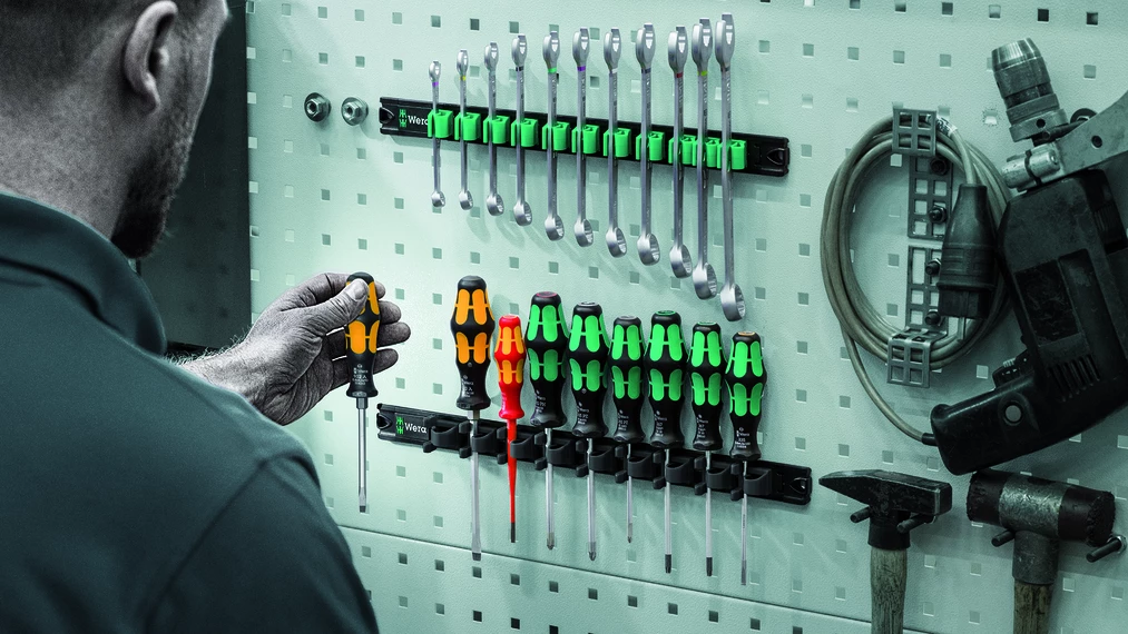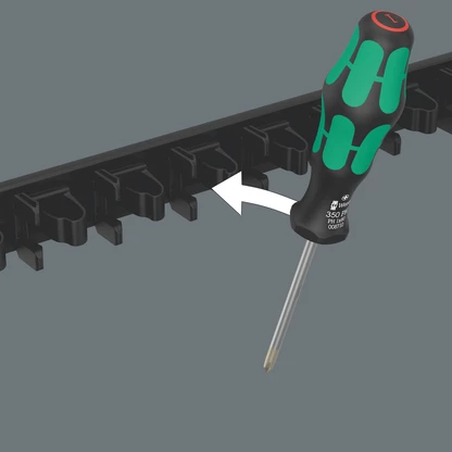 El listón de los muelles de sujeción es de material plástico y ofrece espacio para hasta 9 destornilladores Kraftform. Los fuertes muelles de sujeción sostienen los útiles de manera segura.
