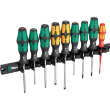 Juego de destornilladores Kraftform de 9 piezas, en un listón de muelles de sujeción. Un juego general de destornilladores. El mango Kraftform Plus permite un trabajo ergonómico agradable que evita la formación de ampollas y callosidades en las manos del usuario. Las zonas duras de agarre permiten altas velocidades de trabajo, mientras que las zonas blandas garantizan una alta transmisión de la fuerza. 932 A con varilla hexagonal pasante y caperuza de golpe; 350, 355 y 335 con Lasertip: el extremo de los destornilladores Wera Lasertip es rugosificado microscópicamente fino por medio de rayos láser. Esta superficie rugosa prácticamente se aferra fuertemente dentro de la cabeza del tornillo como si tuviera dientes. Ya no es posible que suceda un resbalamiento indeseado del útil. 160 iS con aislamiento VDE, así como con Lasertip. Lleva el sistema de búsqueda de herramientas Take it easy con marcas a color según el tamaño - para encontrar la herramienta precisa de manera fácil y rápida. Los muelles que integra el listón permiten un alojamiento perfecto y seguro de los útiles. Gracias al fuerte imán que lleva, el listón se mantiene de forma segura en superficies metálicas. De forma alternativa, el listón también se puede atornillar en la pared.