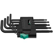 Juego de llaves acodadas de alta calidad para tornillos de TORX® interior. En parte con cabeza de bola: La bola en el brazo largo permite un trabajo seguro incluso en situaciones de montaje difíciles. El tratamiento de superficie Black Laser proporciona una protección excelente de la superficie, también con relación a la corrosión, y garantiza una larga vida útil. Gracias a las marcas con el tamaño que están grabadas a láser de forma resistente y duradera, las llaves acodadas se tienen a mano rápidamente. Se encuentran en el clip práctico de material resistente al desgaste, para un alojamiento duraderamente seguro y una extracción descomplicada de las llaves acodadas.