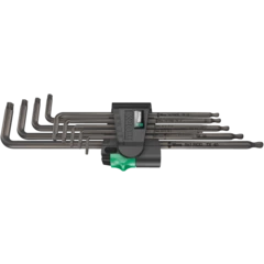 Juego de llaves acodadas de alta calidad para tornillos de TORX® interior. Con función de sujeción para tornillos TORX® según especificación de Acument Intellectual Properties en el brazo largo. Un brazo extra-largo. Llave acodada con camisa envolvente de plástico elaborada de un material redondeado agradable al tacto y agarre. Esta camisa facilita el trabajo también en ambientes de temperaturas bajas, lo hace más agradable y cuida los dedos. Dispone del sistema de búsqueda fácil de herramienta Take it easy con una marcación de la herramienta según el tamaño. El tratamiento de superficie Black Laser proporciona una protección excelente de la superficie, también con relación a la corrosión, y garantiza una larga vida útil. Gracias a las marcas con el tamaño que están grabadas a láser de forma resistente y duradera, las llaves acodadas se tienen a mano rápidamente. Se encuentran en el clip práctico de material resistente al desgaste, para un alojamiento duraderamente seguro y una extracción descomplicada de las llaves acodadas.