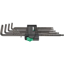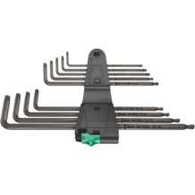 Juego de llaves acodadas de alta calidad para tornillos de TORX® interior. En parte con cabeza de bola: La bola en el brazo largo permite un trabajo seguro incluso en situaciones de montaje difíciles. El tratamiento de superficie Black Laser proporciona una protección excelente de la superficie, también con relación a la corrosión, y garantiza una larga vida útil. Gracias a las marcas con el tamaño que están grabadas a láser de forma resistente y duradera, las llaves acodadas se tienen a mano rápidamente. Se encuentran en el clip práctico de material resistente al desgaste, para un alojamiento duraderamente seguro y una extracción descomplicada de las llaves acodadas.