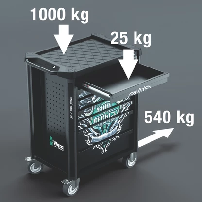 Carro de herramientas para el taller exclusivo en el diseño Tool Rebel. 5 cajones planos y 2 cajones altos permiten una organización eficaz y móvil de las herramientas y del material. El carro es muy robusto por su doble pared y la construcción completamente soldada de todo el conjunto. Sirve para el uso cotidiano duro y exigente en el taller. Contiene 4 depósitos de espuma de Wera: el depósito de espuma 9710 juego de destornilladores Set 1, el depósito de espuma 9720 juego de carracas Zyklop 8000 A Set 1, el depósito de espuma 9731 juego de llaves de boca y anillo Joker 6003 Set 1, el depósito de espuma 9740 juego de llaves acodadas Set 1.