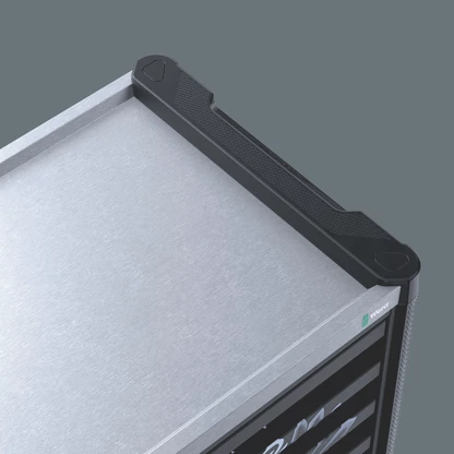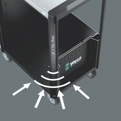 Gracias a su doble pared y a la construcción completamente soldada de todo el conjunto, el carro de las herramientas para el taller Tool Rebel es extremamente robusto. La protección de los bordes en todas las cuatro esquinas y el concepto de amortiguación interior ofrecen una protección contra los choques sumamente fiable.