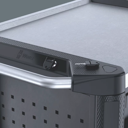 La posición lateral de la cerradura es muy ergonómica y sirve para una mejor manejabilidad. Además protege la llave y la cerradura ante posibles daños. El sistema de cierre es sumamente robusto, así las herramientas que se alojan en el carro quedan bien protegidas ante un acceso no autorizado. El cierre centralizado se bloquea por medio de una cerradura de cilindro. La entrega incluye dos llaves plegables.