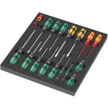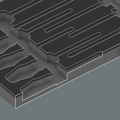 Un depósito de espuma de larga duración; el aspecto bicolor hace que se reconozca muy rápidamente si hacen falta piezas; es adecuado para el carro de herramientas del taller Tool Rebel; viene con 16 destornilladores Kraftform de Wera (para el taller, VDE, destorcincel, Micro) así como 2 garras para atornillar.