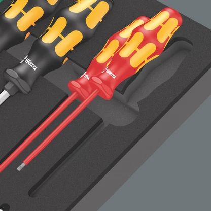- 2 destornilladores Kraftform Plus VDE con varillas aisladas para un trabajo seguro bajo tensiones de hasta 1.000 voltios.