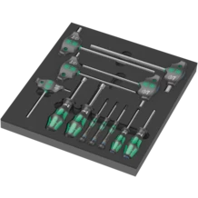 Un depósito de espuma de larga duración; el aspecto bicolor hace que se reconozca muy rápidamente si hacen falta piezas; es adecuado para el carro de herramientas del taller Tool Rebel; viene con 10 destornilladores de Wera (para el taller, Micro y de mango en T) para tornillos de hexágono interior, y 2 destornilladores Wera con vástago hueco para tornillos de hexágono exterior.