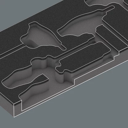 Las herramientas se apoyan de forma segura en la espuma, gracias a las cortes precisas de los contornos. La ubicación inteligente de los útiles permite un alojamiento económico y un acceso rápido a la herramienta precisa.