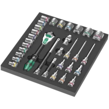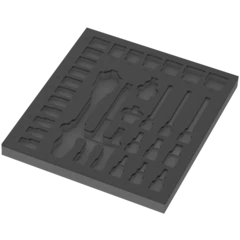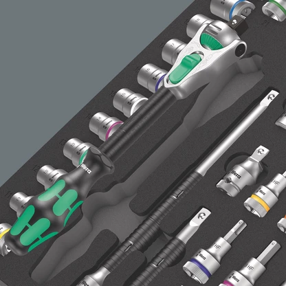 Un depósito de espuma de larga duración; el aspecto bicolor hace que se reconozca muy rápidamente si hacen falta piezas; es adecuado para el carro de herramientas del taller Tool Rebel; viene con la carraca Wera Zyklop Speed de ½" y accesorios de 30 piezas.