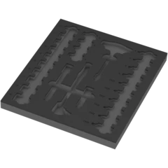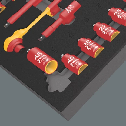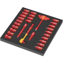1 depósito de espuma resistente; con aspecto bicolor para reconocer de forma rápida si faltan piezas; adecuado para el carro de herramientas para el taller Tool Rebel. Viene con 1 carraca Zyklop 8007 B VDE con palanca de reenvío, 1 destornillador de adaptación de mango en "T" 410 i VDE B, 14 llaves de vaso Zyklop 8790 B, 6 vasos de punta Zyklop 8767 B HF con función de sujeción para tornillos TORX® , 4 vasos de punta 8740 B HF con función de sujeción para tornillos de hexágono interior, 2 prolongaciones Zyklop (corta y larga).