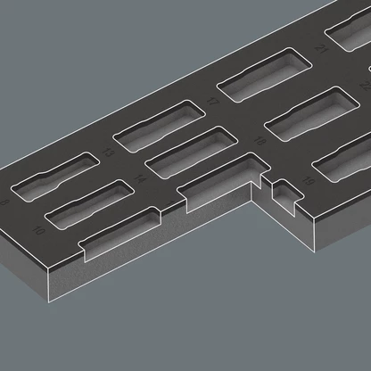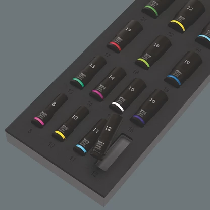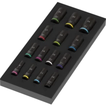 Depósito de espuma duradero; es bicolor para notar rápidamente si faltan piezas; es adecuado para los carros de herramienta para el taller Tool Rebel, y está equipado con: 14 llaves de vaso Impaktor Deep; para el uso con máquinas atornilladoras de golpe, eléctricas o de aire comprimido, con arrastre de 3/8". En la versión larga para uniones atornilladas que se encuentran a profundidad así como para pernos roscados sobresalientes. La tecnología Impaktor permite una duración de la vida útil por encima del promedio, incluso bajo cargas extremas. El perfil hexagonal que se utiliza permite una alta transmisión de la fuerza y al mismo tiempo una gran precisión y un trato cuidadoso del perfil. Lleva el sistema de búsqueda de herramientas "Take it easy": con marcas a color según el tamaño y sellos adicionales con el tamaño grabados a láser.