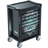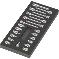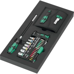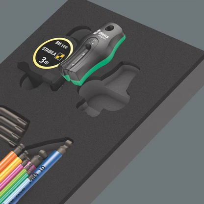 Un depósito de espuma de larga duración; el aspecto bicolor hace que se reconozca muy rápidamente si hacen falta piezas; es adecuado para el carro de herramientas del taller Tool Rebel; viene con el juego de llaves acodadas 950/9 Hex-Plus Multicolour set 1 de 9 piezas de Wera para tornillos de hexágono interior, el juego de llaves acodadas 967/9 TX XL Multicolour set 1 de 9 piezas de Wera para tornillos TORX®, 1 imán 9500, y 1 cinta métrica para el bolsillo Stabila (de 3 m).