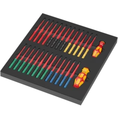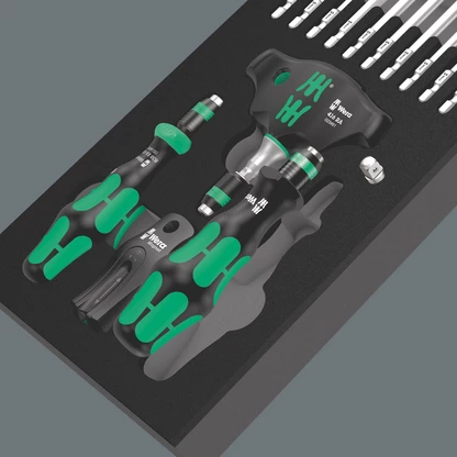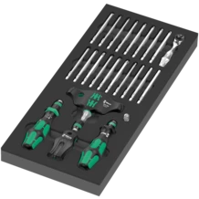 1 depósito de espuma resistente; con aspecto bicolor para reconocer de forma rápida si faltan piezas; adecuado para el carro de herramientas para el taller Tool Rebel. Viene con 1 porta-puntas manual 838 RA-R M con función de carraca y sistema de cambio rápido Rapidaptor; 1 porta-puntas de mango en "T" 416 RA con función de carraca y sistema de cambio rápido Rapidaptor; 1 porta-puntas manual 816 R con sistema de cambio rápido Rapidaptor, 1 carraca de puntas Zyklop Mini 8001 A; todos los porta-puntas y la mini-carraca de puntas son adecuados para puntas de 1/4"; 18 puntas duras y resistentes (1/4", 89 mm de largas), 1 pieza de conexión 870/1 (de hexágono exterior de 1/4" a cuadradillo exterior de 1/4"; 25 mm de larga); 1 aparato de magnetización 9500 para magnetizar y desmagnetizar los extremos de las herramientas.